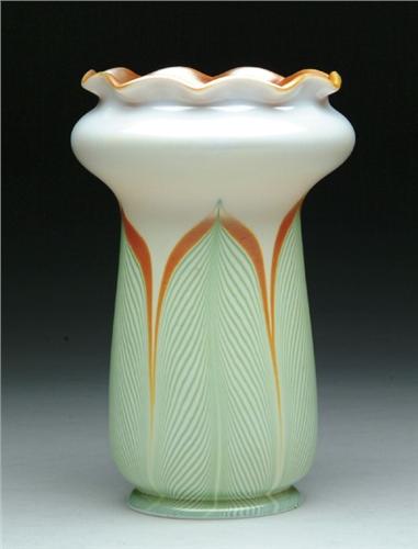 LARGE STEUBEN ART GLASS SHADE. Calcite shade with green and gold pulled feather decoration with gold Aurene interior. Signed with Steuben Fleur de Lis. SIZE: 8-1/4 in. t x 3-3/8 in. fitter. CONDITION: Roughness to fitter, otherwise very good to excellent. 5-60794
