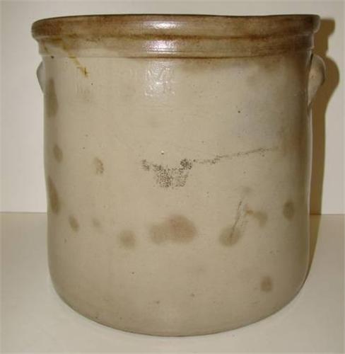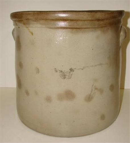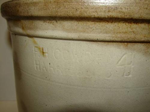 LARGE STONEWARE CROCK WITH EARED HANDLES. 4 gallon. Stamped near top" F.H. COWDEN/HARRISBURG/4". Shows firing marks throughout. 11" H