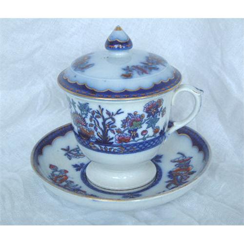 Unusual large cup and saucer with flow blue transfer decoration , which has been hand finished . I am not 100 % sure that the lid belongs to the cup but it is the same pattern and fits well . The lid has two chips with a small hairline by the finial . The saucer has two very light hairlines . Also the pieces are lightly crazed with a little wear on the gilding Impressed ' Pearl ' on the base of the cup . PACKING AND POSTAGE TO USA $ 20.00 , UK £ 7.00