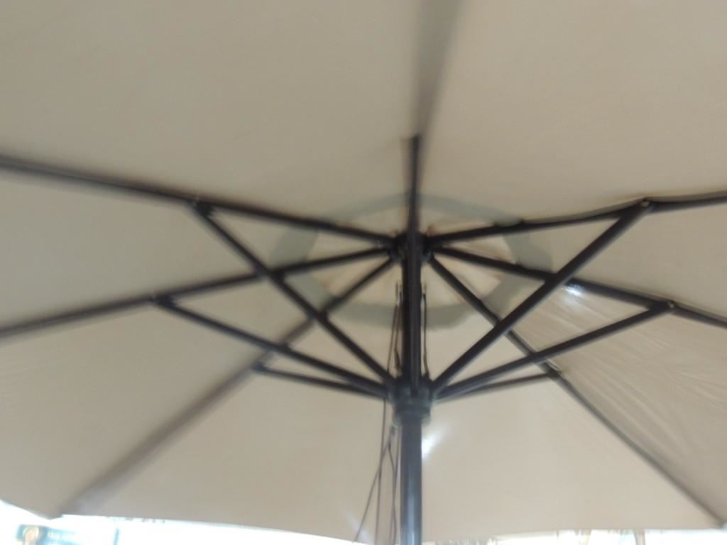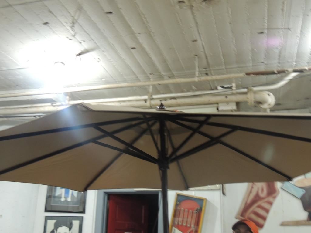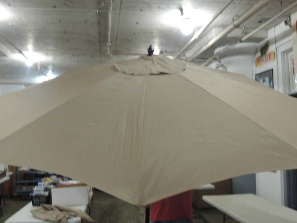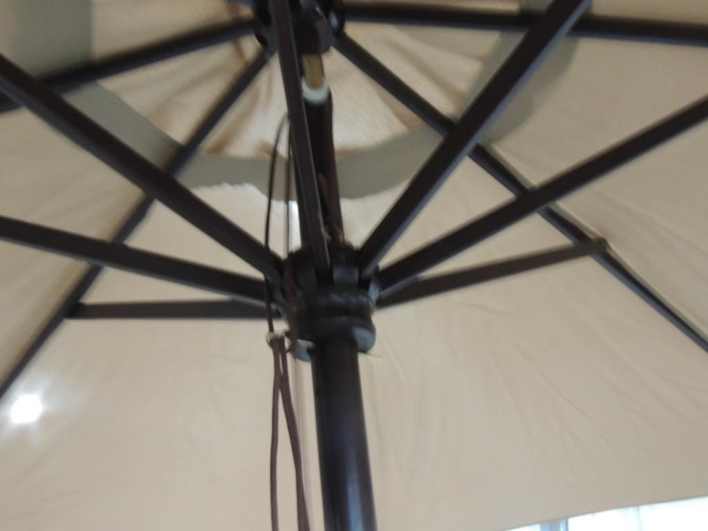 NEW UMBRELLA, PATIO UMBRELLA, TAN WITH STORAGE BAG, OUTDOOR UMBRELLA, DARK WOOD, UMBRELLA AS SHOWN SEE PHOTO FOR MORE DETAILS.