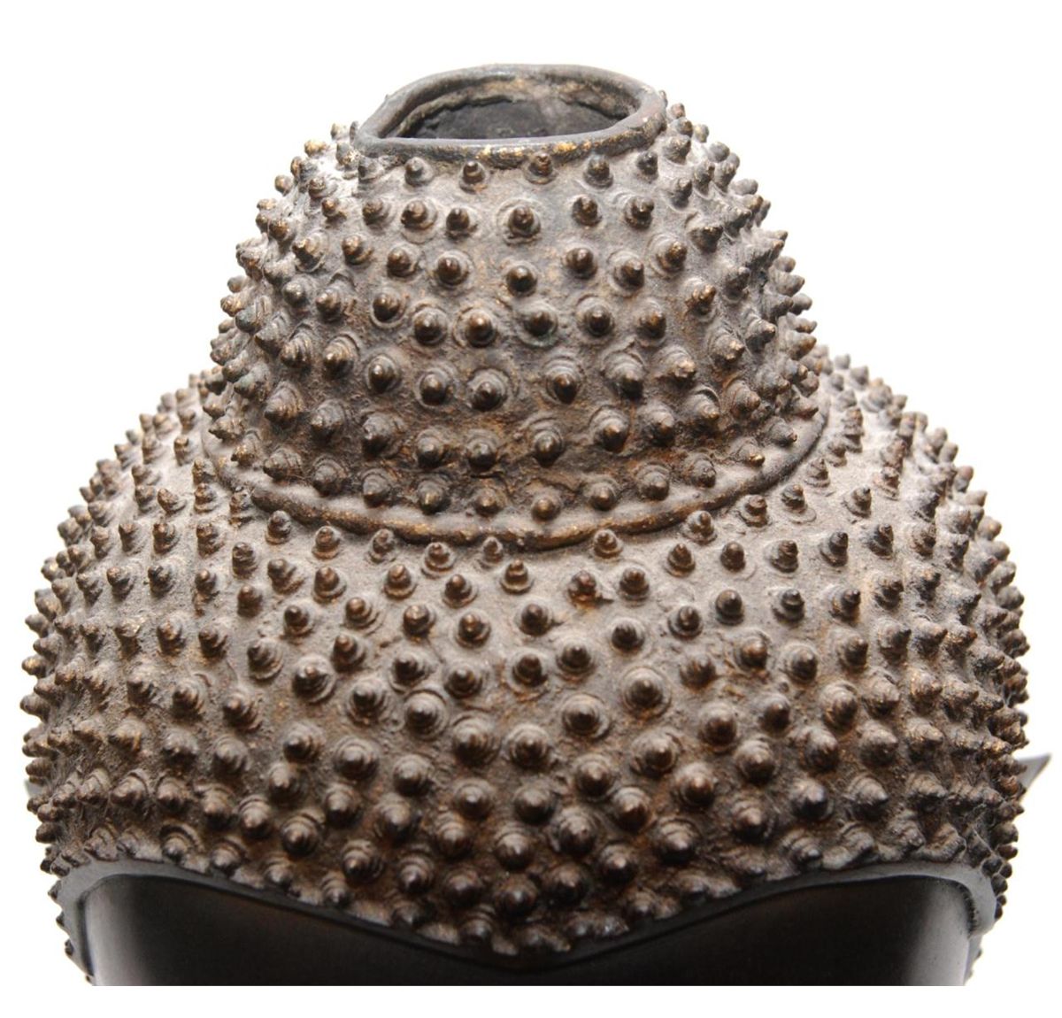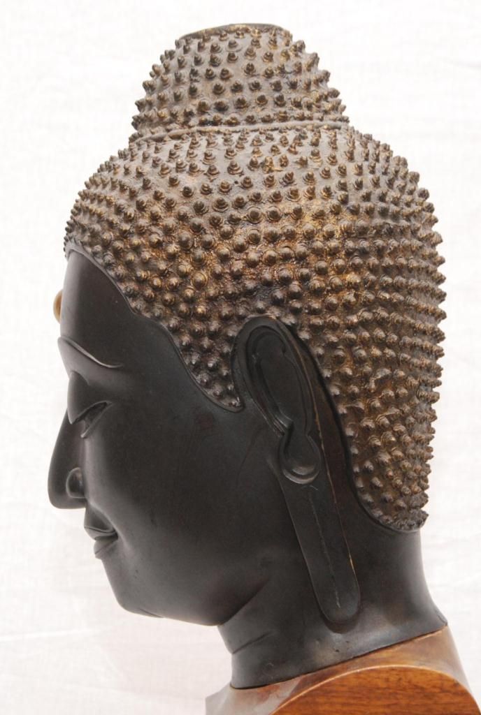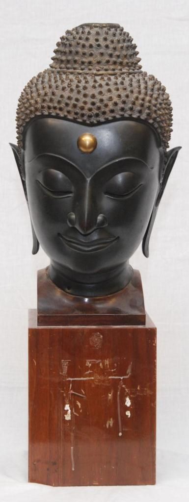 A large Thai bronze sculpture depicting Buddha head with black patina and gold dot to forehead. Mounted on wooden fitted base. 19th/20th century. Measures 17" height + 11 1/2" base height (43.1cm + 29.2cm). Total weight of 24.66 kilograms.