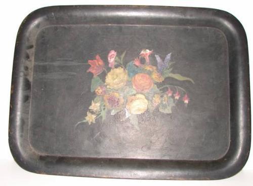 LARGE TOLEWARE FLORAL DECORATED TRAY. Floral decoration at center. Shows minor loss to paint. 29.75" x 21.5"