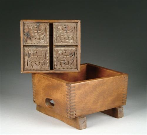 LARGE TWO PART SQUARE CARVED WOOD BUTTER MOLD. Four type Kinerson type combination mold. The square butter mold made up of two carved molds each having two prints. All the same design with what appears to be a ""CS"". Butter print is held in a tapered square housing with turned handle. The outside machine dovetailed case having two cleat. SIZE: Butter print is 5in. x 4-1/2in.. Overall is 3-3/4in. h x 6in. w x 5-1/2in. d. CONDITION: Very good. 9-25382