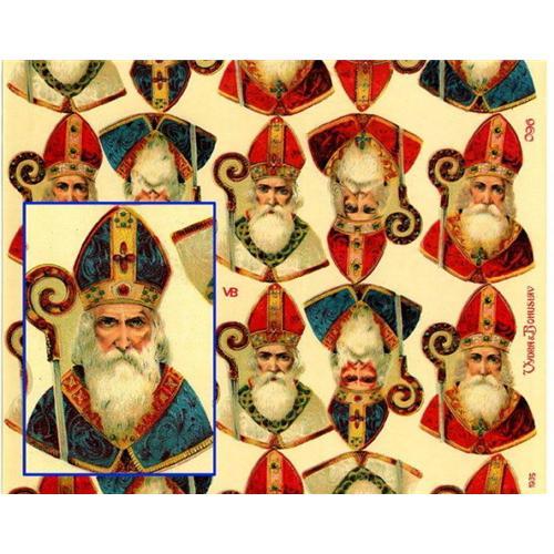</font></strong>Rare piece of Christmas paper collectible - large uncut scrap sheet of Saint Nicholas. There are 23 images on this large 15"x 10" sheet, each 3-1/4" high. There are 3 versions of St. Nicholas on this sheet - (8) red jeweled hat and white robe, (8) blue jeweled hat and blue robe, (7) red jeweled hat and red robe. Marked VB, number 096, dated (6th edition) 1935. This vintage chromolithograph coated with gummastic based laquer survived its 65 years of age in excellent condition. St. Nicholas Day (December 6th) was very popular Holiday in Europe. On this day small children were visited by trio of St. Nicholas, Devil and an Angel. The Devil reminded them that they should listen to their parents and behave well - otherwise he would take them with him. The Saint Nicholas would then reward the children usually with gingerbread cookies with the St. Nicholas, Devil or Angel scraps pasted on them. Please refer to"Christmas Ornaments, Lights & Decorations" by George Johnson, page 104. Listed (1987) value of a single scrap is $5-10. Single scraps in this condition is hard to find, full sheets are very scarce!!! Please note that we are picturing only part of the sheet, because it is to large to fit in the scanner. </font>