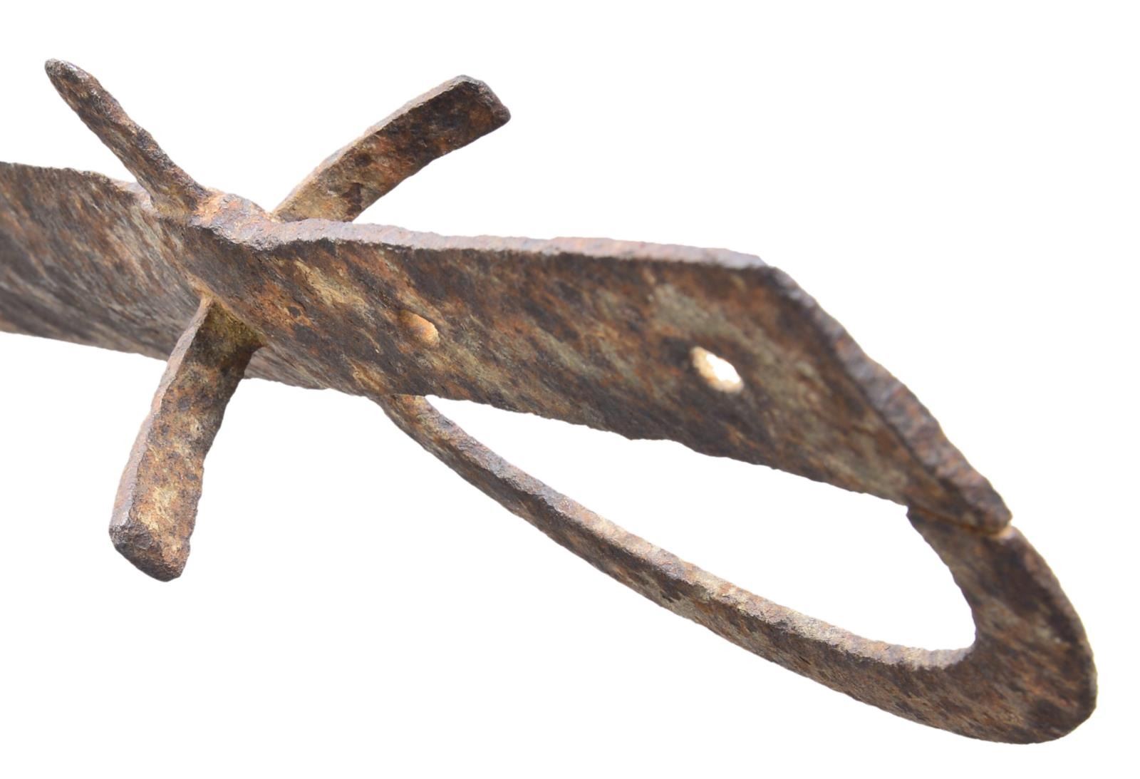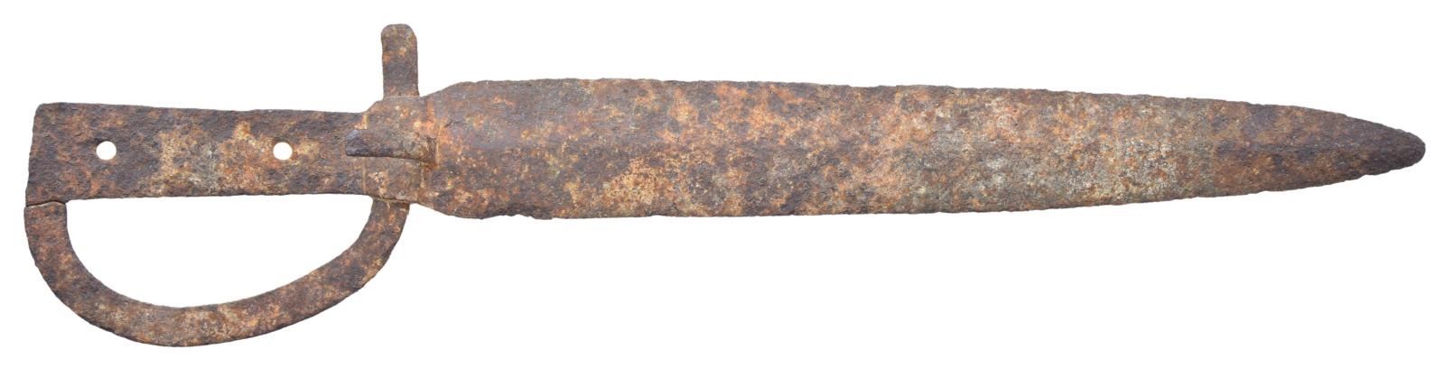 MIDDLEBURG, VIRGINIA. 22” overall, 16” double edged spearpoint blade, over 2” wide, blacksmith forged flat knucklebow inserted through integral blade/tang. There is additional inserted perpendicular reverse “C” shaped 4” guard just below knucklebow. This is unusual form and only one known. CONDITION: good for excavated relic, heavy iron patina, pitting. Ex-Compton Labauve collection. (02-17219/JS). $2,000-3,000.