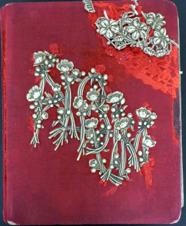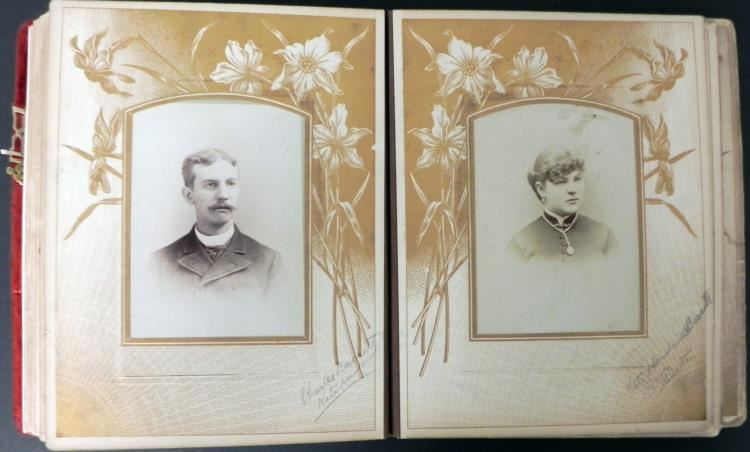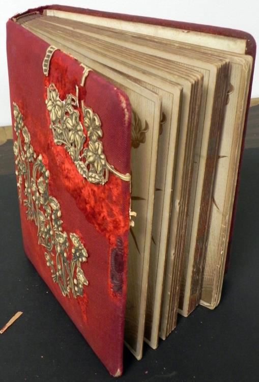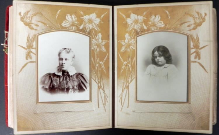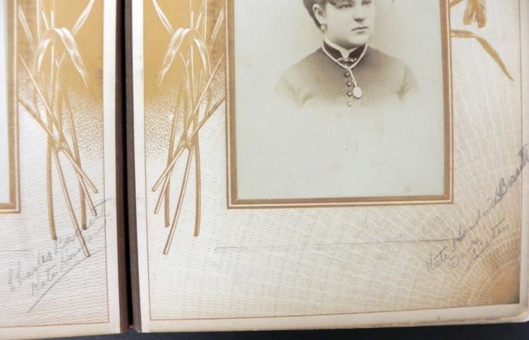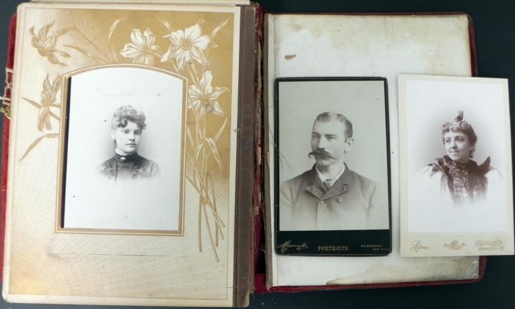 HERE IS A LARGE VICTORIAN ERA PHOTO ALBUM W/35 PHOTOS AND THICK BOARD PAGES. INTERESTING STUDIO SHOTS--SPINE SEPARATION ON ALBUM