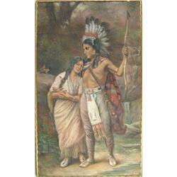 LARGE VICTORIAN INDIAN PAINTING. This nearly life-sized painting depicts a handsome Indian brave with feathered bonnet and bow with a beautiful squaw amid a forested background with waterfalls in the background. Very nicely done. It has a small simple gold tinted frame. SIZE: 37-1/2” w x 63-1/2” h. CONDITION: Painting appears to be very good to excellent; frame has some small losses along the edge. 8-87208