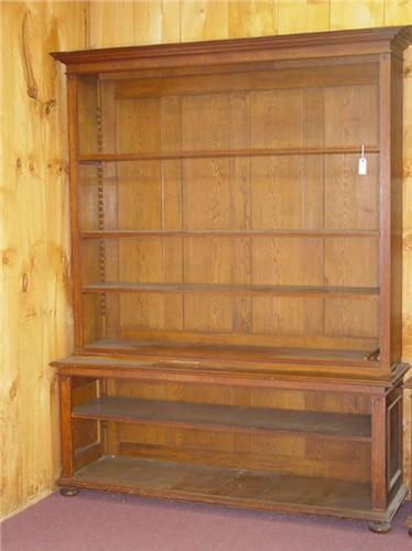 LARGE VICTORIAN OAK 2 PC. STEPBACK LIBRARY BOOKCASE W/ MOLDED CORNICE & ADJUSTABLE TOP & BOTTOM SHELVES, ON BUN FEET (91" H X 70" W X 20 1/2" D) - WEAR & IMPERFECTIONS