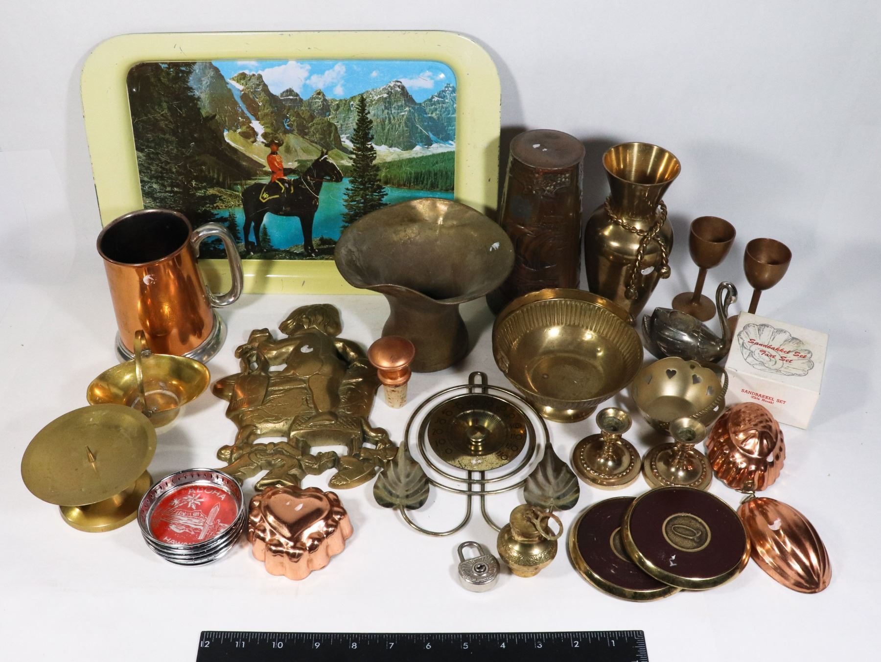 FLEMISH COPPER MADE IN CANADA MUG, SPITTOON, BAKE MOULDS, BRASS COASTERS, RCMP ON HORSE TRAY, THERMOMETER ETC