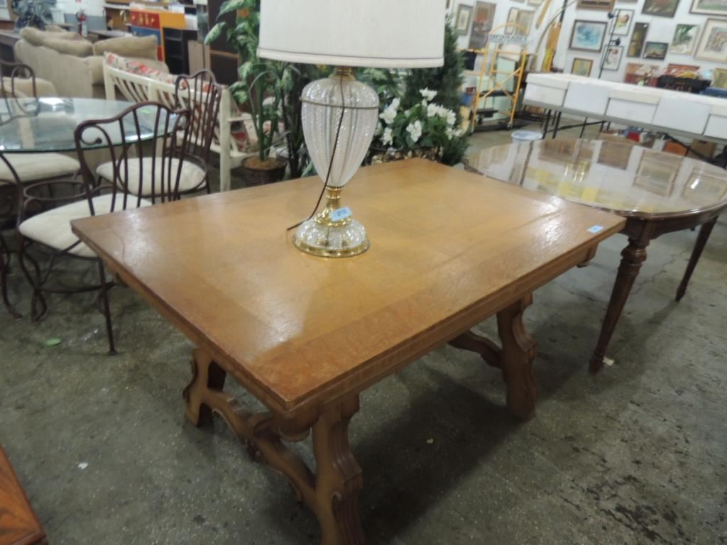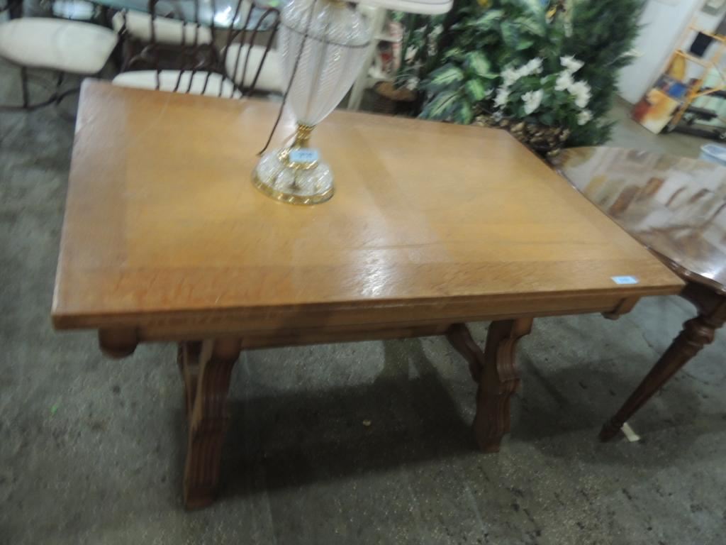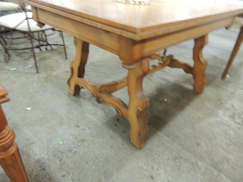 DINNING TABLE AND CHAIRS. TABLE 56" X 36" OAK? DECORTIVE AS SHOWN SEE PHOTO FOR MORE DETAILS
