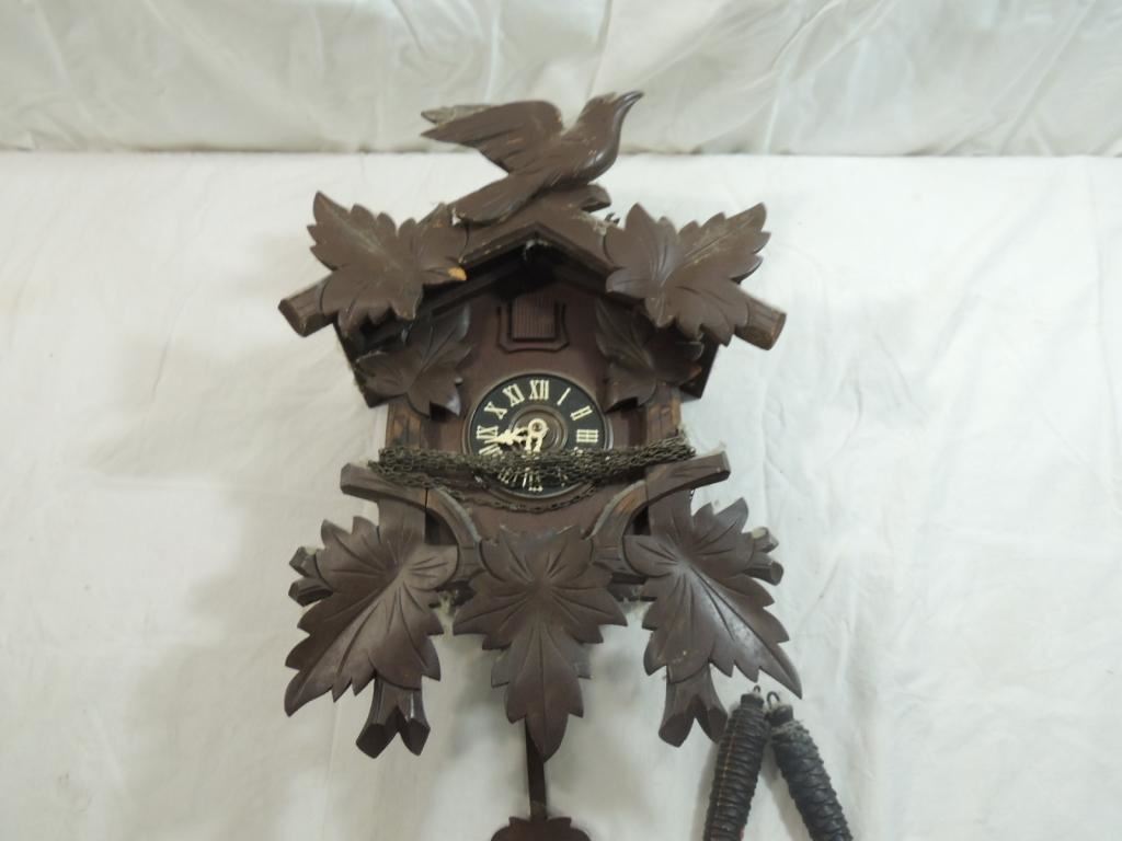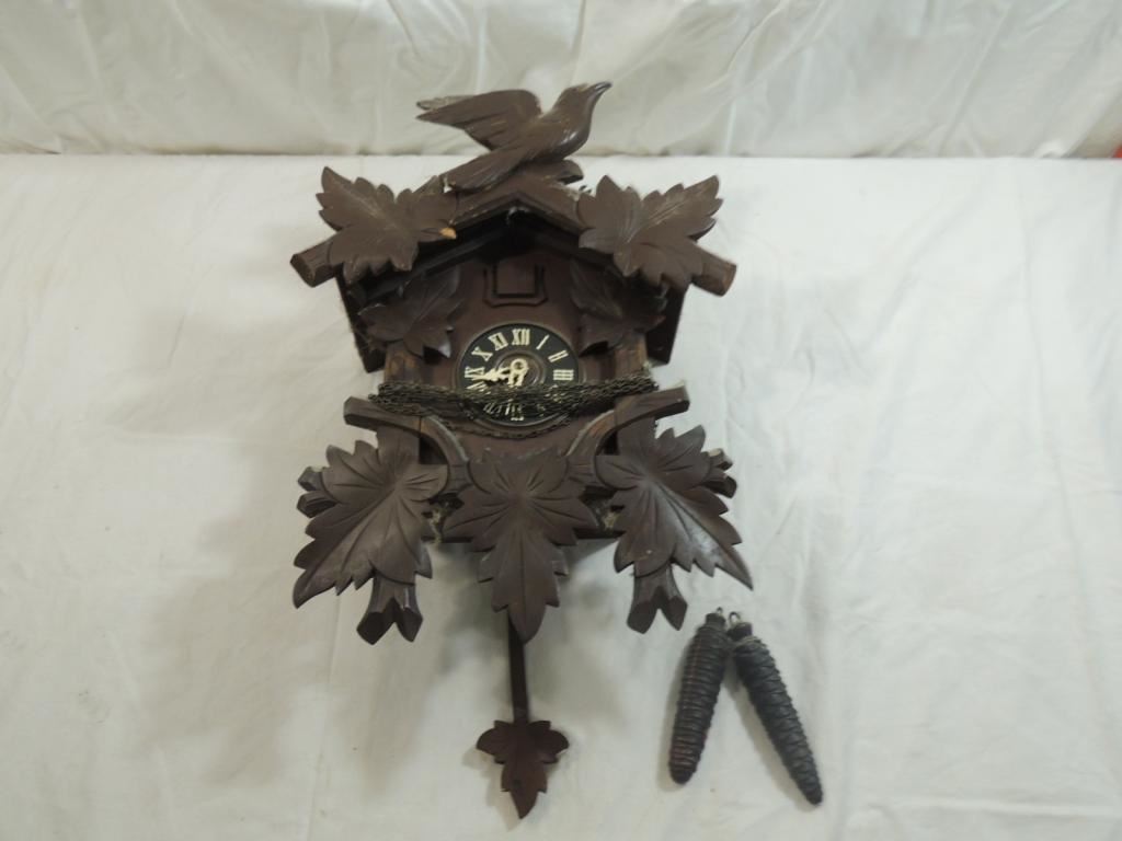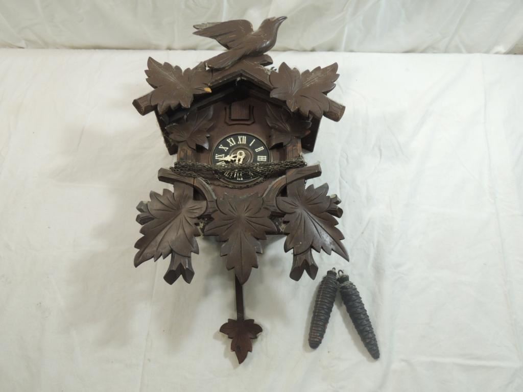 CUCKOO CLOCK, GERMAN CLOCK, COO COO CLOCK, WORKING CLOCK, WOODEN DETAIL CLOC, BLACK FOREST CLOCK, VINTAGE COLLECTORS CLOCK, AS SHOWN SEE PHOTO FOR MORE DETAILS.
