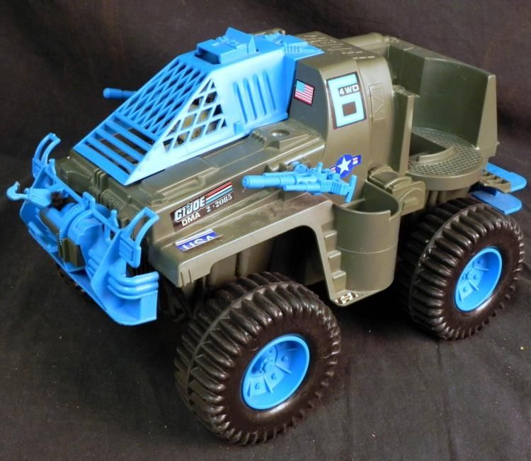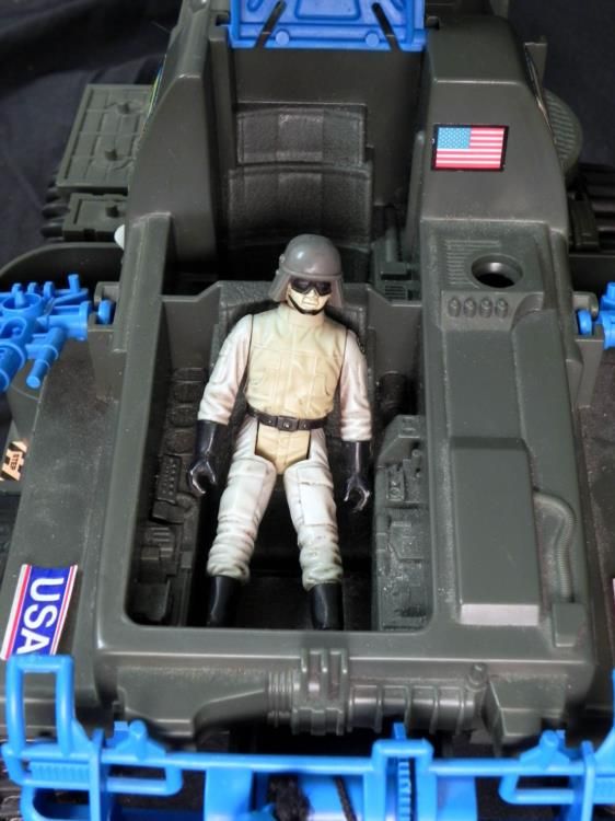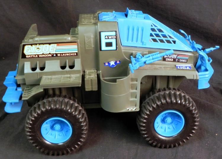 LARGE VINTAGE GI JOE BATTLE WAGON M-LAUNCHER W/GI JOE FIGURE--BATTERY OP-WORKS---GREAT VINTAGE GI JOE MATTLE WAGON AND MISSILE LAUNCHER WITH A GI JOE FIGURE THAT IS REMOVEABLE & SITS INSIDE--BATTERY OPERATED-STILL WORKS FINE--FORWARD REVERSE--SIZE: 13" LONG--8" HIGH--8" WIDE;