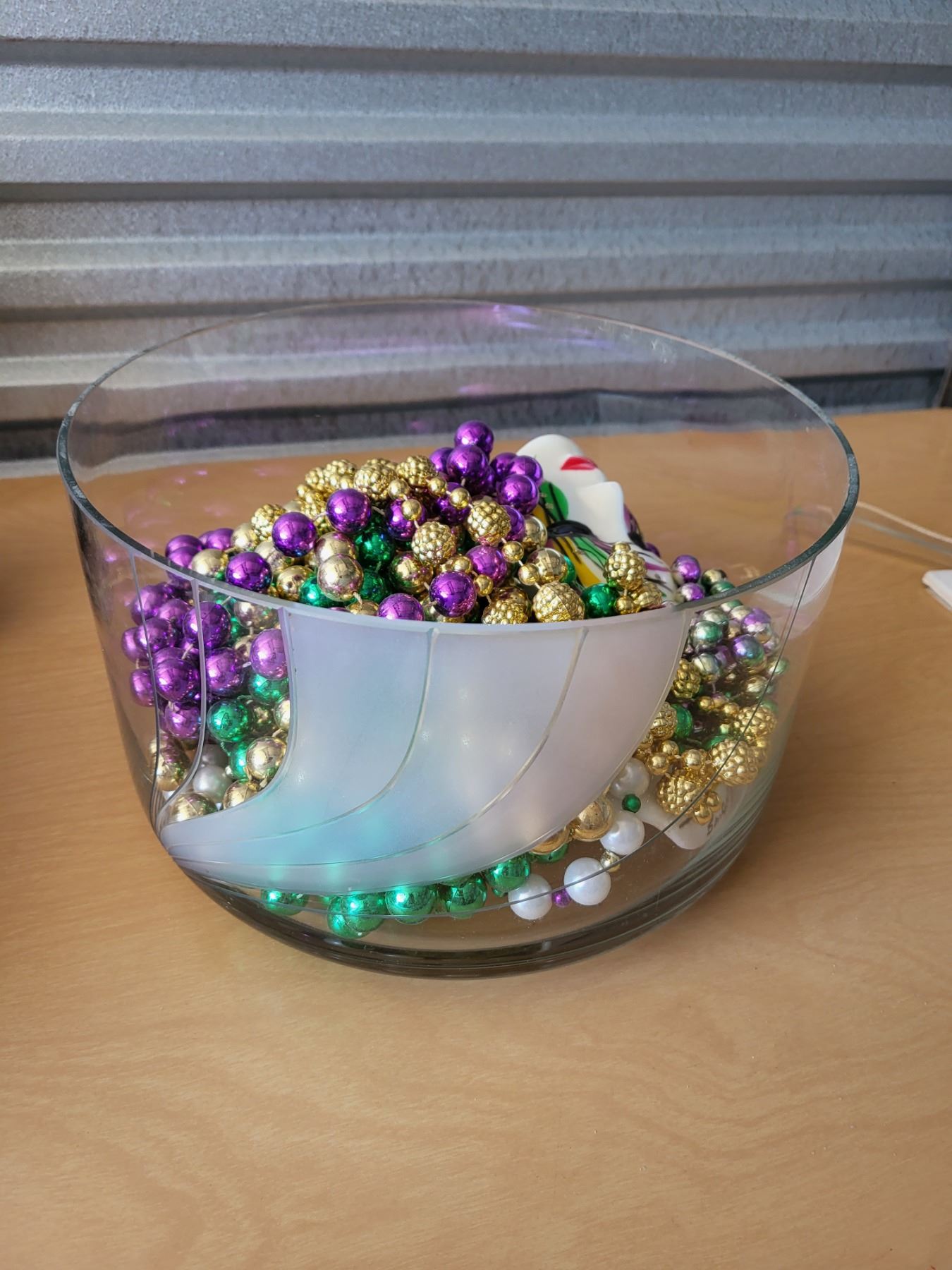 LARGE VINTAGE GLASS BOWL WITH MARDI GRAS ACCESSORIES