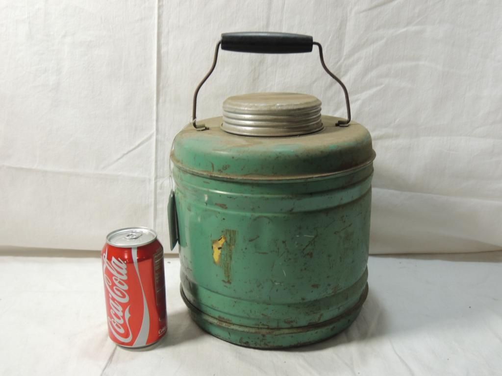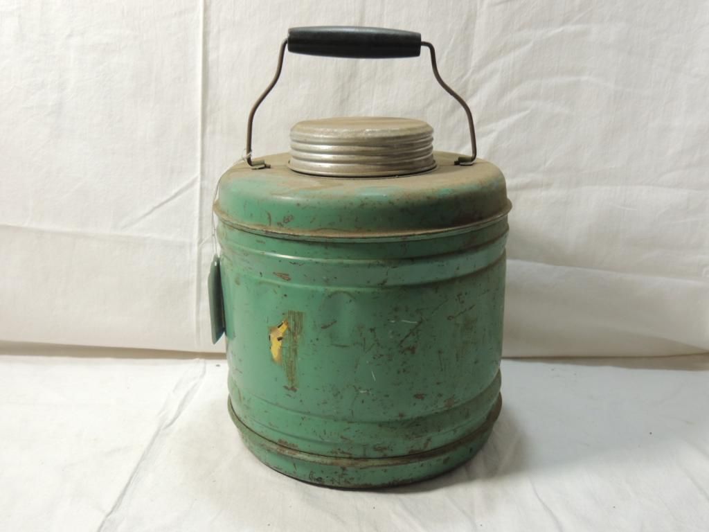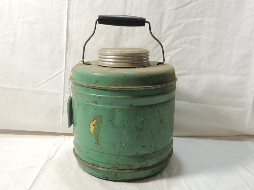 ANTIQUE VINTAGE GREEN THERMOS METAL DRINK COOLER WITH WOODEN BAIL HANDLE LARGE FARMHOUSE JUG RUSTIC HOME DECOR LARGE GREEN VINTAGE THERMOS 1940S GALLON THERMOUS GIFT FOR HIM. AS SHOWN. SEE PHOTO FOR MORE DETAILS.