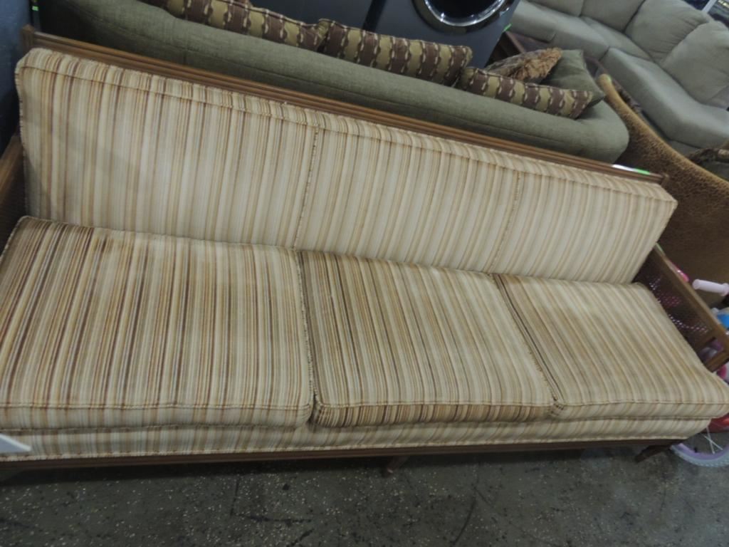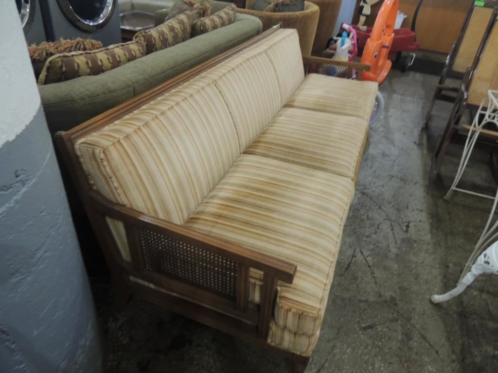 LARGE VINTAGE SOFA, VINTAGE WICKER SOFA, CUSHIONS, GOOD CONDITION, UPHOLSTERED AS SHOWN SEE PHOTO FOR MORE DETAILS.