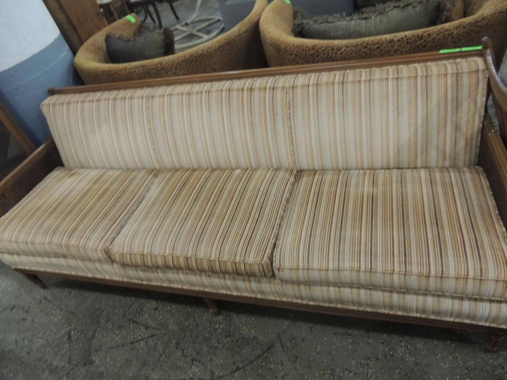 LARGE VINTAGE SOFA, VINTAGE WICKER SOFA, CUSHIONS, GOOD CONDITION, UPHOLSTERED AS SHOWN SEE PHOTO FOR MORE DETAILS.