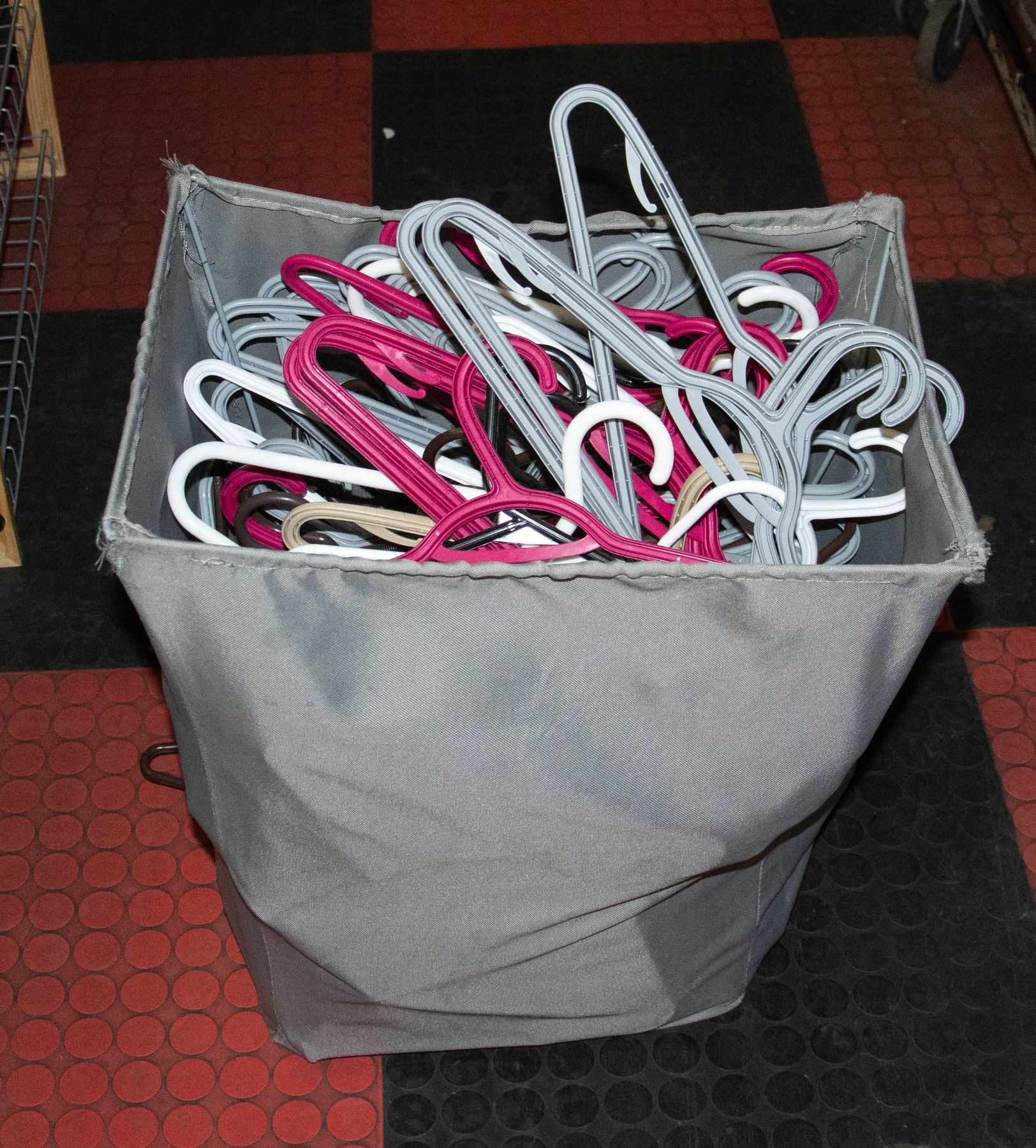 LARGE VOLUME OF HANGERS IN LAUNDRY HAMPER