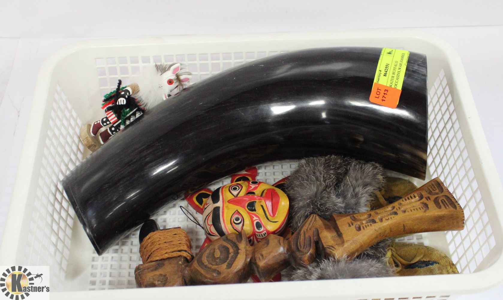 LARGE WATER BUFFALO HORN, MOCCASINS, WAR HAMMER
