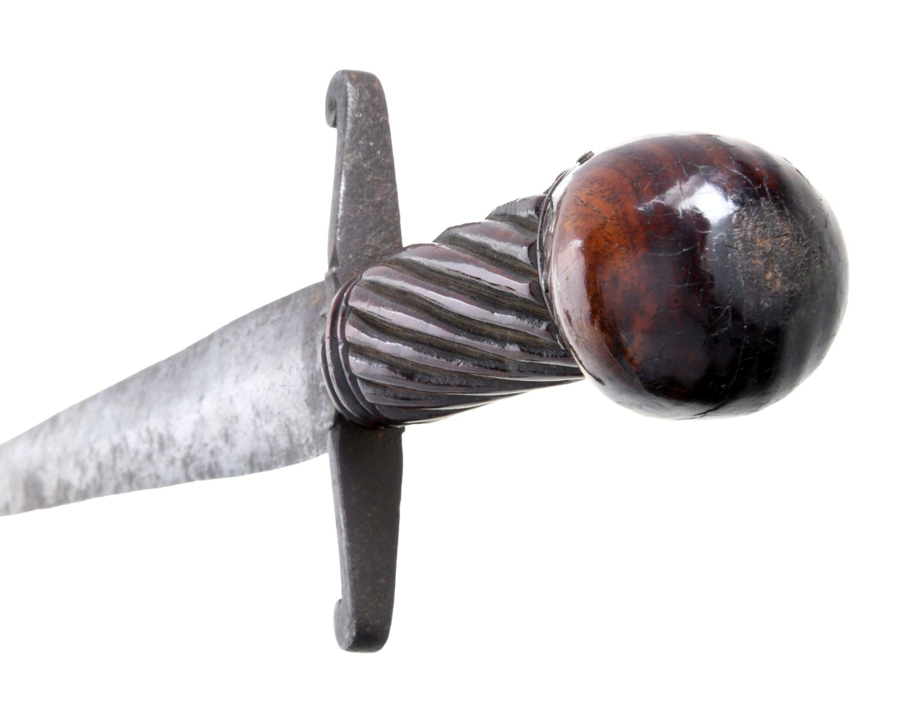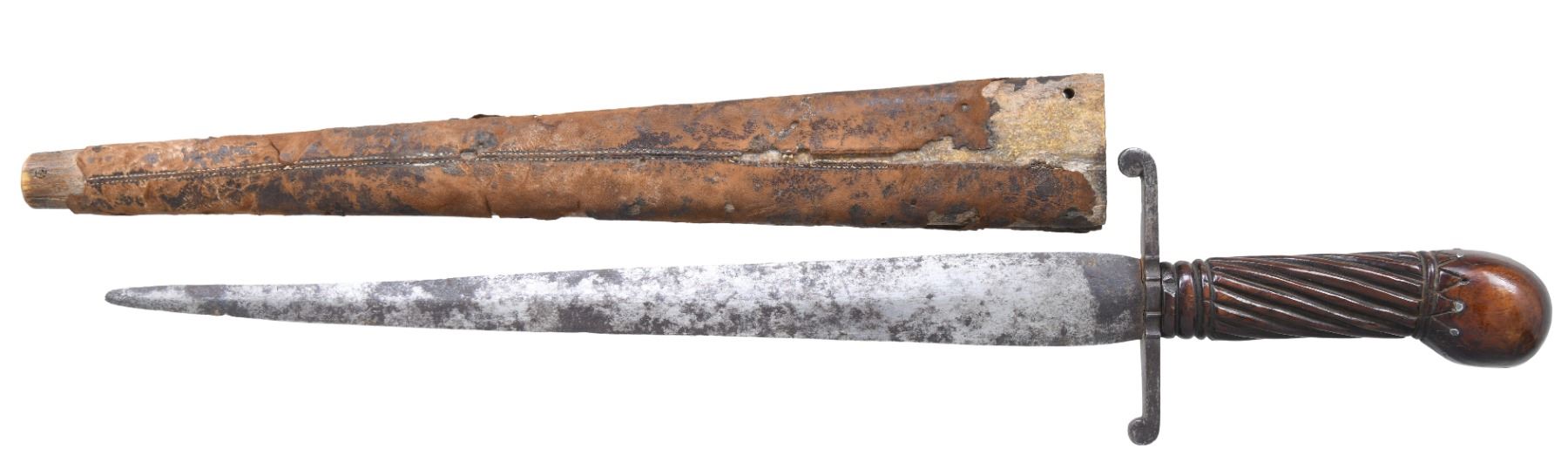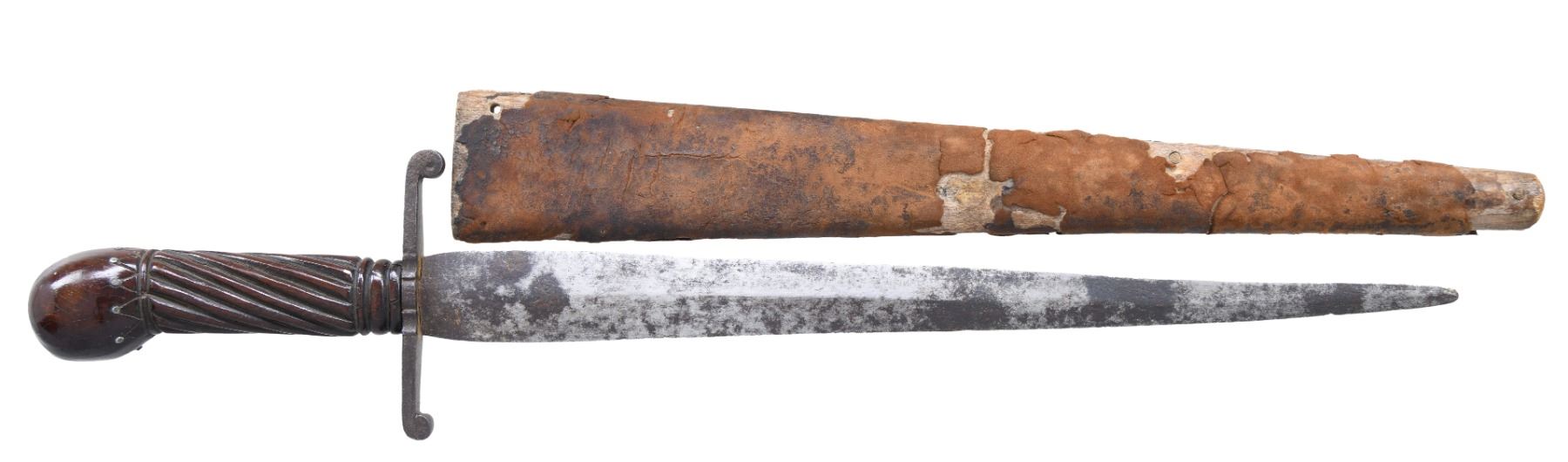 19.5" overall, 14" tapered dagger point blade with central spine, 4" forged cross guard, burl handle, sculpted with spiral cut ribs, silver pins and ball pommel. Scarce whalebone sheath is carved to fit long tapered blade and sewn leather cover. CONDITION: good to very good overall, stained worn tip to blade, fine handle with couple well patinaed chips. The sheath is separating near tip where whalebone pins are loose, leather cover with losses, scuffing, glued repair near tip to keep leather in place. (02-23993/JS). NON-GUN. $2,000-3,000.