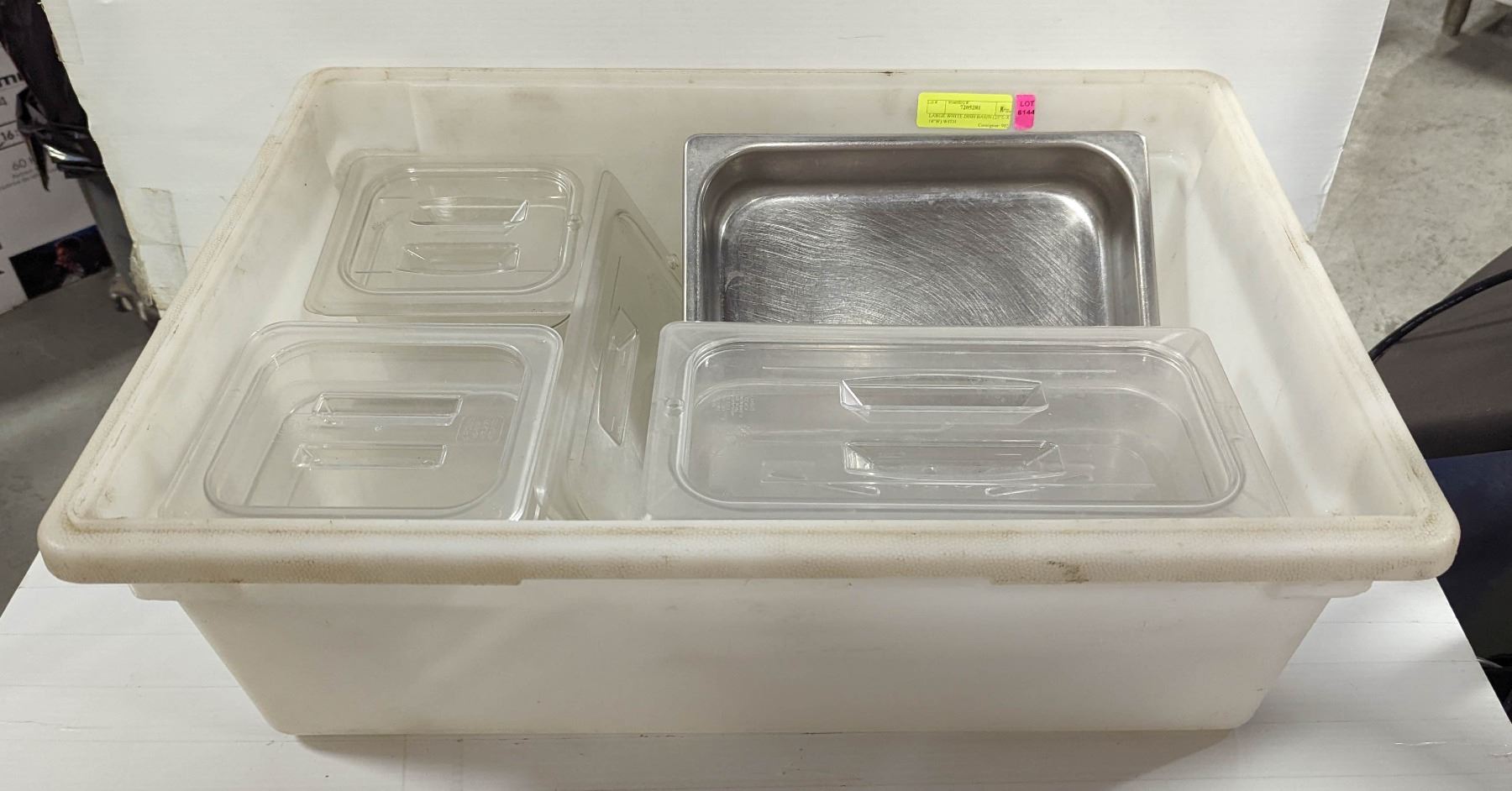 THREE CAMBRO FOOD STORAGE CONTAINERS WITH LIDS (6.5"L X 7"W X 6"-TALL), THREE FOOD STORAGE CONTAINERS (12.5"L X 7"W X 4"-TALL) AND 1 STAINLESS STEEL BUFFET TRAY (12.5"L X 10"W X 2.5"-DEEP) **ALL ITEMS MUST BE REMOVED BY 5PM MONDAY, DECEMBER 12TH, 2022. ALL REMAINING ITEMS WILL BE SUBJECT TO A $6.00 PER DAY STORAGE CHARGE. ANY ITEMS REMAINING AFTER MONDAY, DECEMBER 26TH, 2022 WILL BE CONSIDERED FORFEITED. NO REFUNDS WILL BE ISSUED FOR FORFEITED ITEMS. TO SCHEDULE A PICK UP APPOINTMENT CLICK HERE