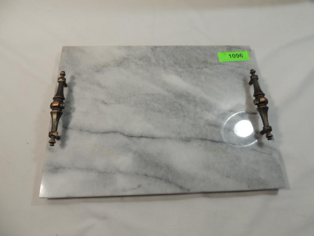 LARGE WHITE MARBLE CUTTING BOARD TRAY. HANDLES FOOTED AS SHOWN SEE PHOTO FOR MROE DETALIS.