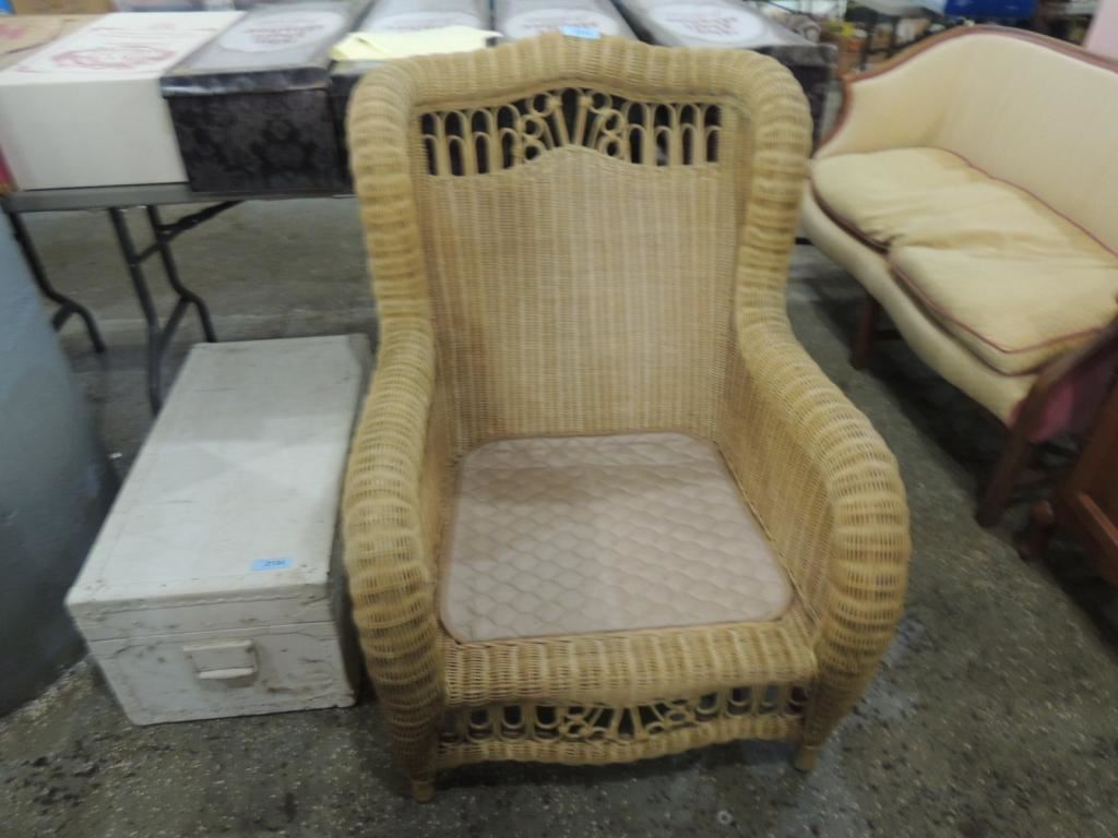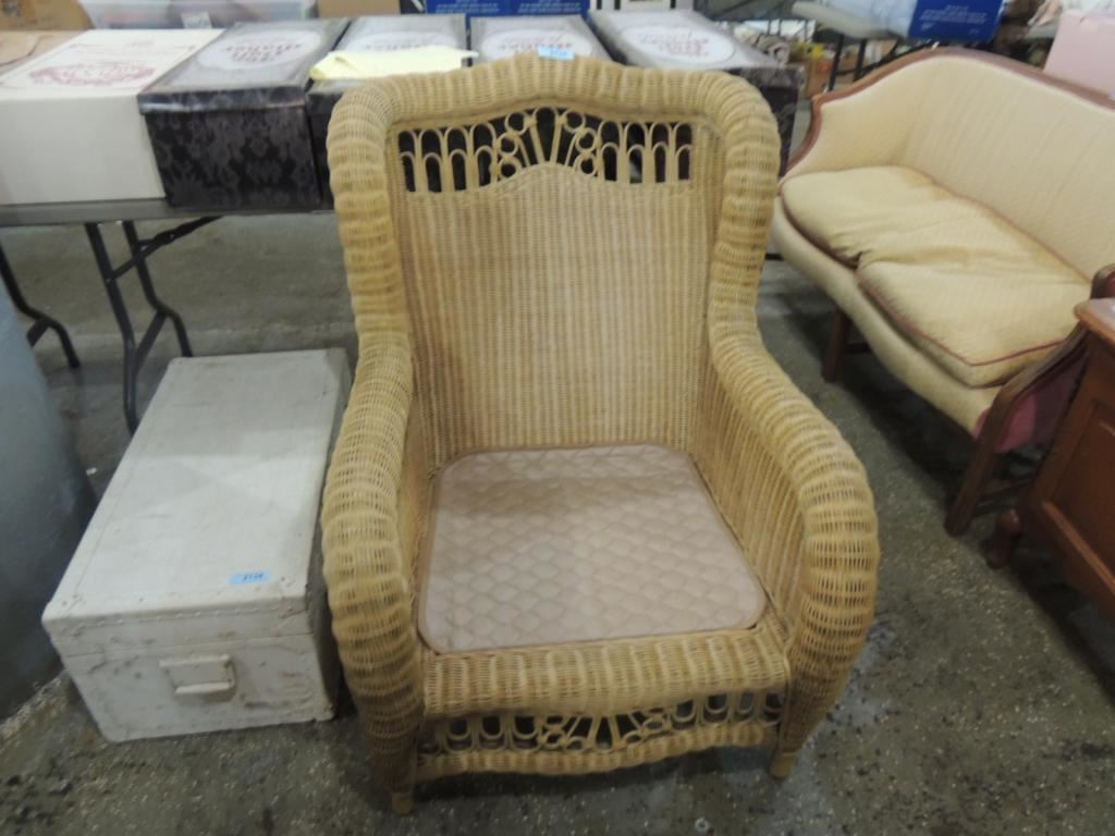 POTTERY BARN STYLE, HIGH QUALITY WICHER, TALL BACK, NEEDS CUSHION, VINTAGE, INDOOR AND OUTDOOR FURNITURE, DESIGNER FURNITURE, AS SHOWN SEE PHOTO FOR MORE DETAILS.