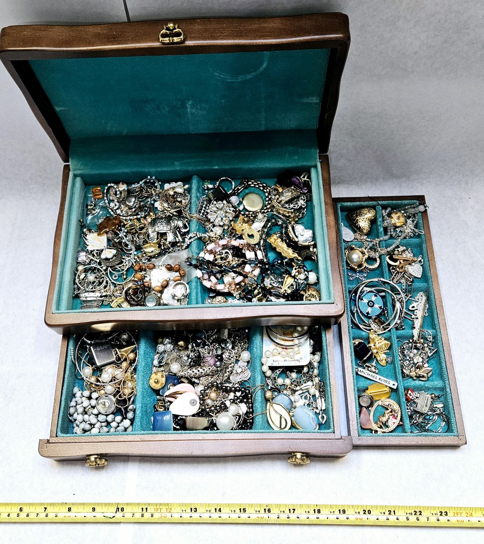 LARGE WOOD 3 LEVEL JEWELRY BOX WITH CONTENTS