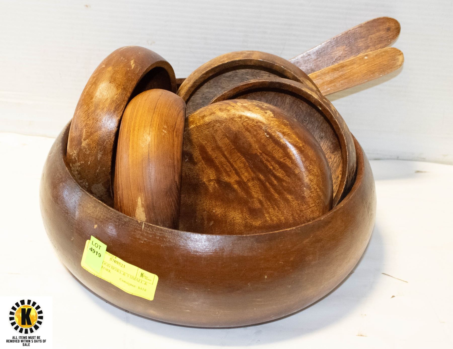 LARGE WOOD BOWL & 5 SMALL & SPOON & FORK