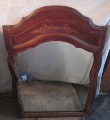 LARGE WOOD FRAMED MIRROR, CARVINGS ON TOP