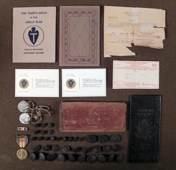 OFFERED HERE IS A LARGE WWI GROUPING TEXAS PVT 1ST CLASS-Co "L"-144TH INFANTRY. THIS OUTSTANDING WWI DOUGHBOY GROUPING FROM COMPANY "L" 144TH INFANTRY, STATE OF TEXAS INCLUDES: VICTORY MEDAL WITH MEUSE-ARGONNE & DEFENSIVE SECTOR BARS, RIBBON BAR, DISCHARGE * PAPERS IN LEATHER FOLDER, CITATION, DOG TAGS, UNIFORM BUTTONS, COLLAR BRASS CO L WALLET, AND 36TH TEXAS DIVISION BOOKS. *