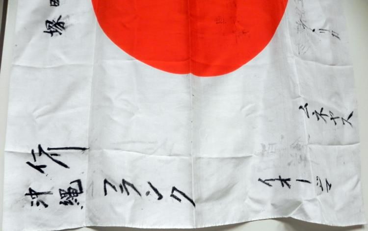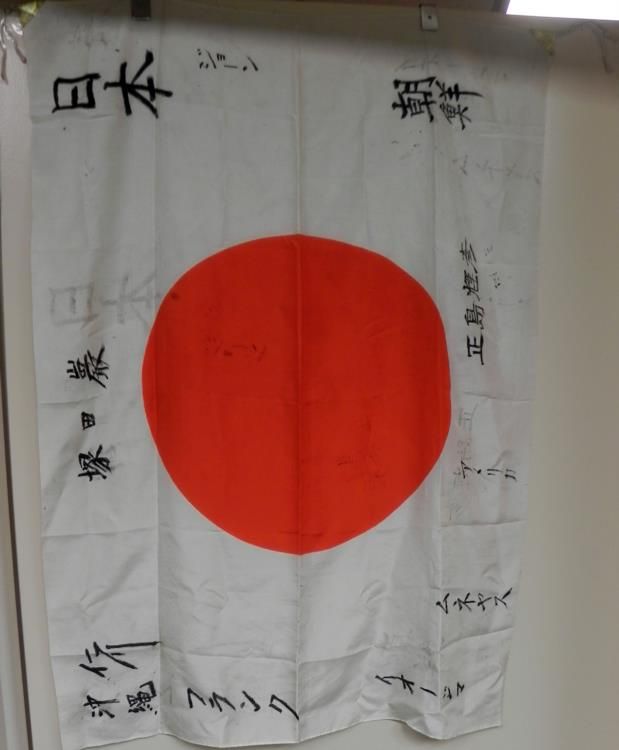 OFFERED HERE IS A LARGE WWII JAPANESE SILK FLAG WITH "WELL WISHER'S" KANJI-MEATBALL- IT'S DIMENSIONS ARE 27X38" AND HAS BOTH TIES AT TOP SIDES -- IN GREAT CONDITION.