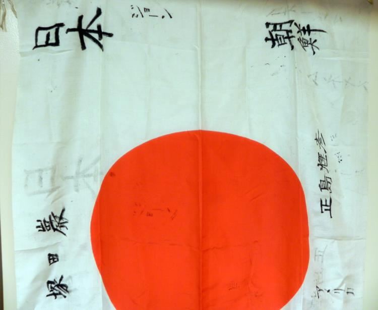 OFFERED HERE IS A LARGE WWII JAPANESE SILK FLAG WITH "WELL WISHER'S" KANJI-MEATBALL- IT'S DIMENSIONS ARE 27X38" AND HAS BOTH TIES AT TOP SIDES -- IN GREAT CONDITION.