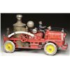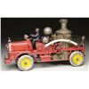 This toy is the mate to the previous lot (ladder truck). It is massive in size with a number of interesting features including the removable nickel plated tank directly in back of the driver, the searchlight in front of the driver, expansion ball connected to the steam pumper, and a rear standing fireman to be placed in various positions. As with the ladder truck, a separately cast front bumper with the license plate number 7232. Toy is enameled in red with a large nickel plated boiler and iron simulated balloon tires. Removable rubber hoses with iron couplings accompany the pumper. SIZE: 14" l. CONDITION: Appears to be in good condition with some possible old overpaint to red surface. 1-12838