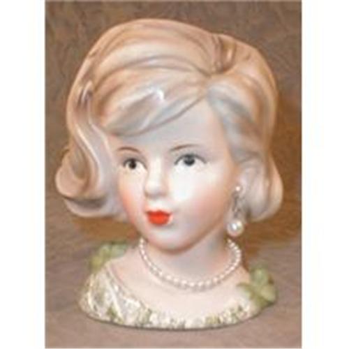 Pretty blond head vase with blond updo. Green dress with ribbons on the shoulders. She wears a necklace and an earring in her exposed ear.