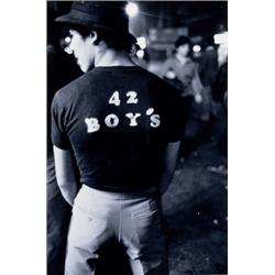 LARRY CLARK (American, b. 1943) UNTITLED (42ND STREET BOYS) signed "Larry Clark" in pencil on verso vintage gelatin silver print 14 x 11 in. (35.6 x 27.9 cm) 1979-1980 from the TEENAGE LUST series PROVENANCE Private Collection, NEW YORK LITERATURE Larry Clark, TEENAGE LUST, NEW YORK, 1983, n.p. (illustrated) After the critical success of his first book, TULSA, Larry Clark received an NEA grant that allowed him to publish a second volume of photographs. Released in 1983, TEENAGE LUST expanded the local terrain of TULSA with pictures shot in California, Mexico, New York, and elsewhere. Befitting this wide range of locations, Clark's new photographs often featured runaway teenagers and chronicled their peripatetic lives of prostitution and drug abuse. TEENAGE LUST closes with a sequence of photographs shot in midtown Manhattan during the early 1980s. Several of these images, including the present work, capture scenes of prostitution along 42nd Street. Here a young man stands with his back to the camera, announcing his neighborhood with the sparkling decal on his shirt. A glimpse of his smiling face suggests both the cocky hauteur of a streetwise kid and a trace of human vulnerability amidst the gritty urban environment. "I got off the subway at 42nd Street," Clark recalls. "And I got my camera. And I've always loved 42nd Street. It's always been my favorite street in New York.... There's that innocence there. A lot of the 42nd Street pictures are just that. I mean, some of the pictures of the kids when I first met them and they were looking at me with those come-on looks.... I thought that was so obvious, but nobody had a clue these kids were hustling" (Larry Clark, TEENAGE LUST, 1983, p. 27).