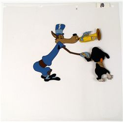 Here the wolf is rocking out on the trumpet and the pig can do nothing but give the wolf a bewildered stare. This is an original animation cel from th