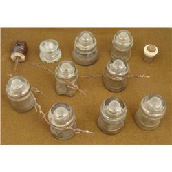 11 OLD INSULATORS FOR HIGH TENSION WIRES. SOME OF THEM COME WITH BARBED WIRE. * *