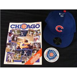 This lot contains a fitted New Era Chicago Cubs hat, a pin, and a program. First is three New Era Chicago Cubs hats. The hat is all blue, fitted, and