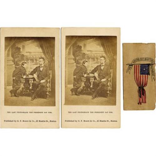 <B>TWO </B></I><B><I>CARTES DE VISITE</B></I></B></I><B>, “LAST PHOTOGRAPHS OF PRESIDENT LINCOLN” AND A COLORFUL MOURNING ITEM, 1865</B></I>. Two <I>carte de visite</B></I> images are attributed to Alexander Gardner. He photographed Lincoln more than thirty times, more than twice as often as any other photographer. This image of Lincoln, with his son Tad, was photographed at Lincoln’s last known sitting. Imprint on card, “The last photograph the President sat for”. Published by G. F. Bouve & Co., 41 Brattle St. Boston. Included in this lot is a very colorful patriotic item, “We Mourn our Martyred President.” Measures 2 7/8” x 1 3/8”. <BR><BR><B>Provenance: </B></I>Al. Emmett Fostell Collection<BR><BR><B>Condition:</B></I> Very fine <BR><BR><b>Shipping:</b> Miscellaneous Collectibles, Smal (<a target="_blank" href="http://www.heritageauctions.com/common/shipping.php">view shipping information</a>)