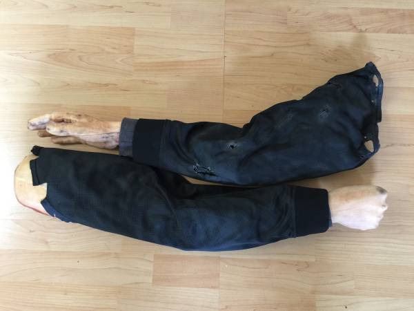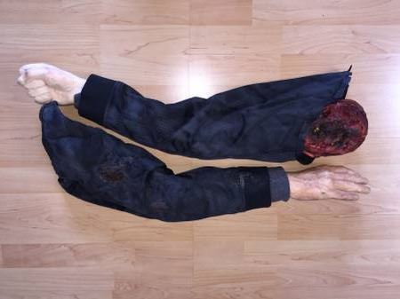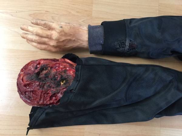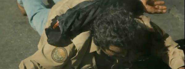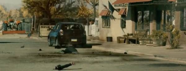In the film Johnnie Knoxville's character shoots a flare at a mercenary strapped with grenades. The result is the mercenary explodes, showering these bloodied, shot up arms, right in front of the camera. One lands in the street and the other one lands on Luis Guzman's head.
