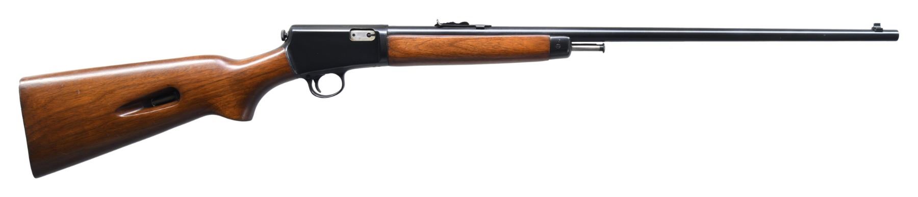 SEMI-AUTOMATIC RIFLE. Cal. 22 LR. S# 176727. Bbl. 23". Model 63 semi-automatic rifle mfg. by Winchester, circa. 1960. The left side of the bbl. is marked with the Winchester trademark logo, followed by the model and cal. designations above "SUPER SPEED AND SUPER - X -". Metal components exhibit a blue finish overall, save for on the bolt and plunger bar. Plain wood pistol grip buttstock and forend, with inverse blued checkered steel buttplate. Dovetailed aluminum beaded blade front sight, with dovetailed U-notch rear sight. Matching numbers are present on the upper and lower assemblies. CONDITION: metal components retain bountiful amounts of their original factory blue finish, exhibiting a few superficial marks from handling and storage, with scattered spots of light surface oxidation present overall. Mirror bore, exhibiting well defined rifling throughout. Wood furniture shows some superficial marks and a few minor impressions from handling and storage, but otherwise remains sturdy and serviceable. A very attractive, final year of production Winchester Model 63 rifle. PROVENANCE: Estate of Russell Dickerman. (25-1784/MLW). CURIO. $400-800.