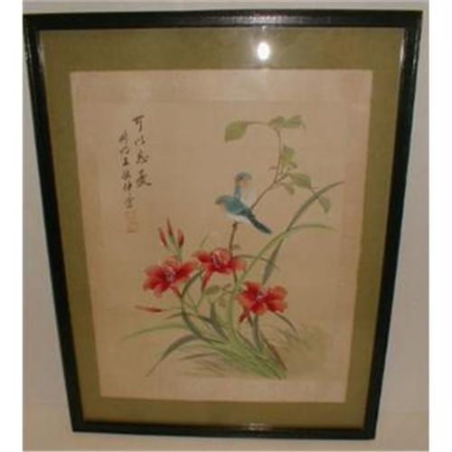<table width="100%" border="0" cellspacing="0" cellpadding="4"><tr><td><em> </em></td></tr><tr> <td width="100%"> The overall size of this Oriental watercolor on silk is 17 3/4" x 23". The actual size of the painting including the 1" textured border is, 14" x 18". This is a very well done painting of Blue Birds with green leafage and red lillies. It is also signed....hard to date but I believe it is late 1800's or early 1900's. Very pleasing and very well done and in excellent condition. It is in a later frame. </td></tr><tr> <td> </td></tr><tr> <td>Reference #: 43</td></tr><tr><td>Condition:VERY GOOD</td></tr><tr><td>Year:LATE 1800'S</td></tr><tr><td>Country:ORIENT</td></tr><tr><td>Height:23</td></tr><tr><td>Width:17.75</td></tr><tr><td>Title:LATE 1800S ORIENTAL WATERCOLOR ON SILK OF BIRDS</td></tr><tr><td>Materials:WATERCOLOR ON SILK</td></tr><tr><td>Location:Southampton, MA</td></tr></table>