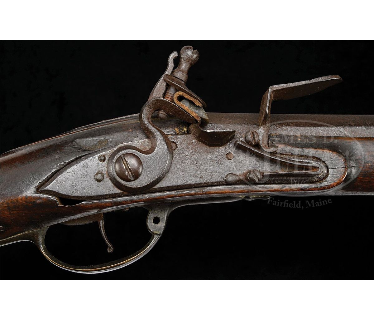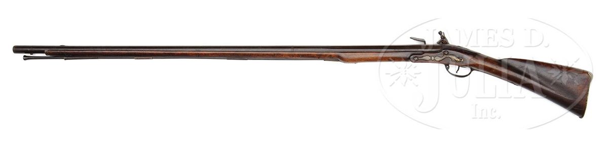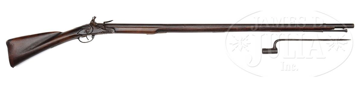 NSN. .74 Cal. X 44-1/4" long unmarked rnd bbl having a faceted breech for 15". Front sight set back 5" from muzzle and bayonet lug set back 1-1/2" underneath bbl. Bayonet that accompanies this gun has a 12-1/2" long blade although it does not fit properly on this musket. The lock is 5-7/8" long unmarked, completely unbridled and the frizzen has been refaced. Brass furniture consists of nose band, 4 bbl shaped rammer pipes, 10" long trigger guard with small finials on each end, 3-step butt tang fastened by three screws, raised flat side plate with an ornamental tail.While the trigger guard has provisions for a sling swivel, the forend does not, indicating parts were gathered from other guns to stock this piece. Complete with iron ramrod. 56" long stock has the architecture of a dual purpose musket/fowler and has been stocked from a combination of available metal work. PROVENANCE: Collection of Dr. Douglas Sirkin. CONDITION: All iron has a deep patina that matches its age, as does the brass furniture, having a nail repair to the rear rammer pipe. Stock has numerous stress cracks on the forend ranging between 1"-5" long not affecting overall appearance. 1/4" long chip missing behind tail pipe in back of lock. 1-1/2" stress fracture on both sides of butt. 1/4" by 1/4" piece missing from the apron behind bbl tang. 4-50022 PAS14