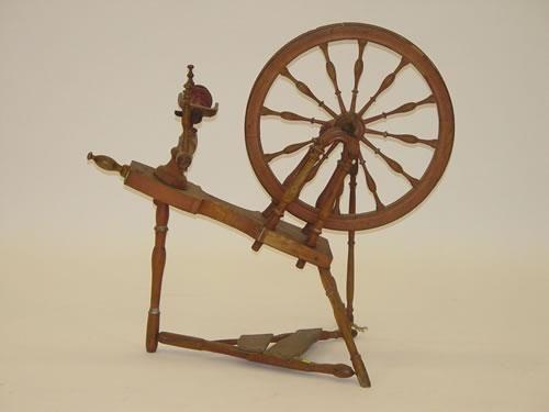 LATE 18TH-EARLY 19TH CENT. MAPLE FLAX WHEEL W/ 12 SPINDLE WHEEL & TRIPOD BASE W/ PEDAL IN OLD RED PAINT (34 1/2" T X 21" W X 36" L) - WEAR, SMALL LOSSES & IMPERFECTIONS