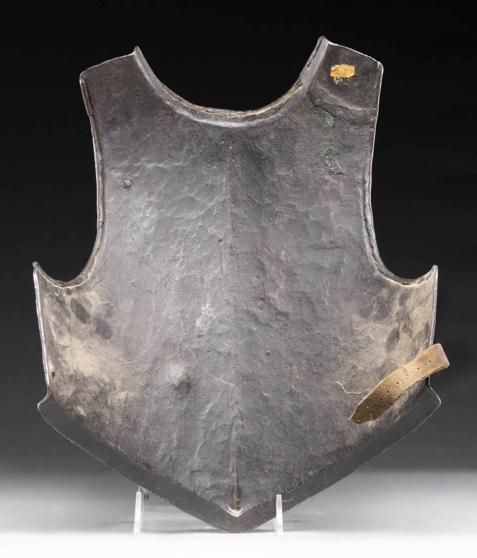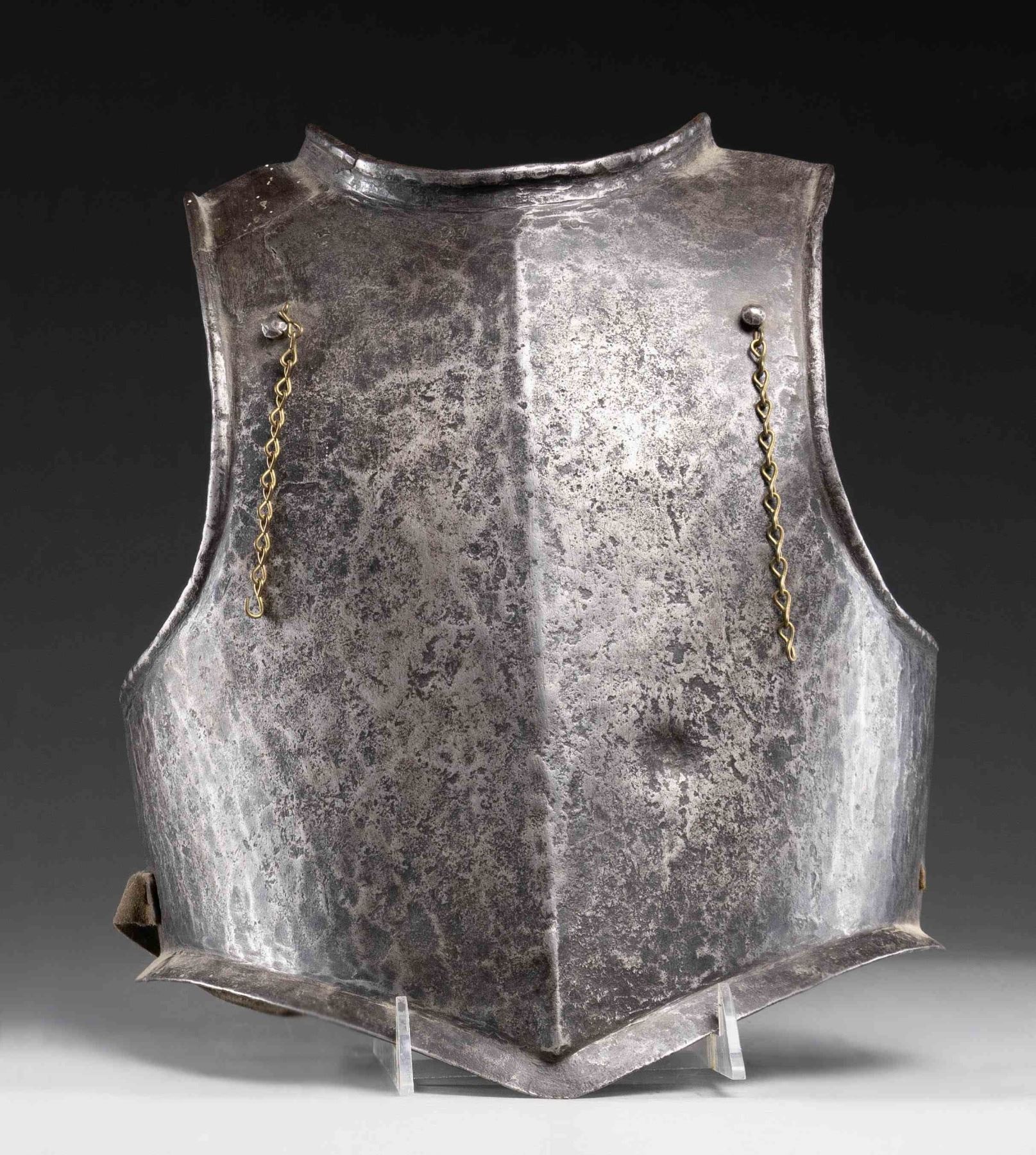 This fine early iron breast plate date to the years 1780 to 1820 and measures about 16 1/2" x 13". The hand forged breast plate has been heavily cleaned, which is common amongst English armor and there is a repair near the right shoulder. There is a test shot in the lower left quadrant which is correct. The buff leather strap on the right side appears original and there is no strap on the left. The brass chains on the front are a modern addition to facilitate display. CONDITION: the piece is quite solid but is repaired at the right shoulder. It has been aggressively cleaned in the past but has begun to acquire a pleasing patina. PROVENANCE: Estate Collection of Nicholas Apergis. (02-24749/BF). $400-600.
