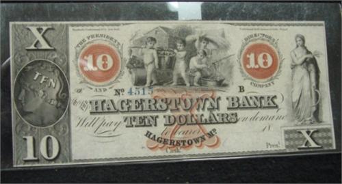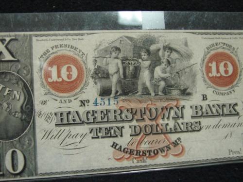 LATE 19TH CENTURY $10 MARYLAND BANK NOTE. No date. From the Hagerstown Bank, Hagerstown, MD.