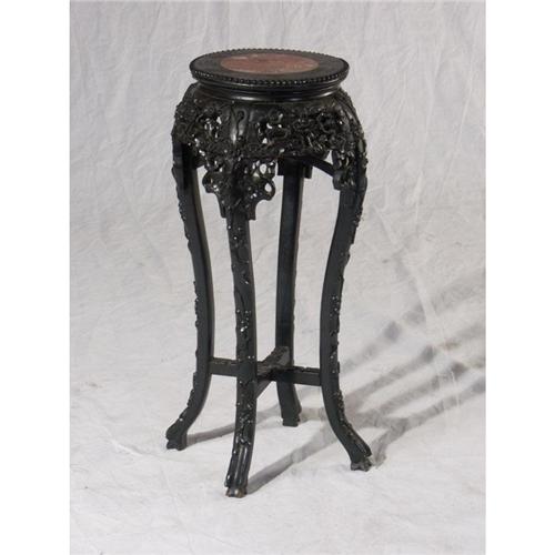 PLANT STAND: Late 19th century Chinese round plant stand, top with rose marble insert and beaded edge, carved apron and legs. 29''h x 14''diameter.