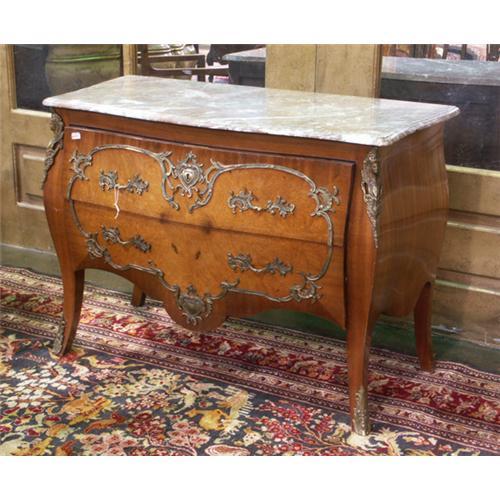 COMMODE: Late 19th century Louis XV style walnut bombe commode, marble top, ormolu mounts. 34''h x 20''d x 44''w