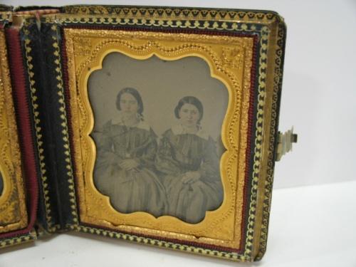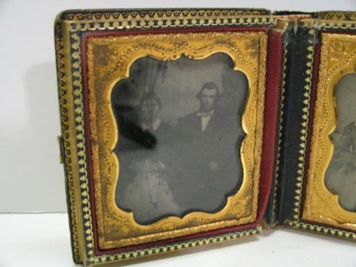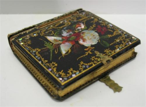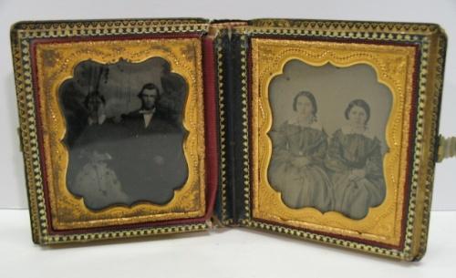 LATE 19TH CENTURY TIN-TYPE HOLDER WITH TWO TIN-TYPES BEHIND GLASS. One picture depicts man and woman and the other picture depicts two young females. Holder is ornately decorated on front cover with floral gilt decoration with mother of pearl inlay. Holder does show damage at binding.