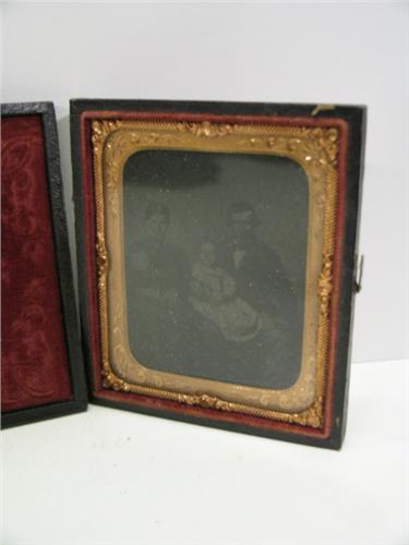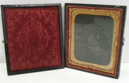 LATE 19TH CENTURY TIN-TYPE IN HOLDER BEHIND GLASS. Depicts a family consisting of husband, wife, and two infant children. Holder shows minor wear and has lost binding.